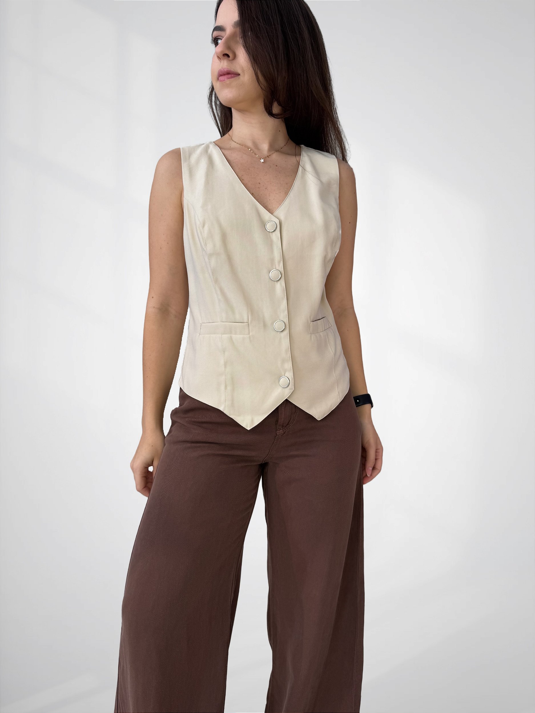 O Colete Feminino Curto em Alfaiataria é confeccionado em tecido de alta qualidade, com 90% viscose e 10% poliéster, garantindo leveza, conforto e um caimento estruturado. O modelo possui comprimento curto, ideal para composições modernas e elegantes.