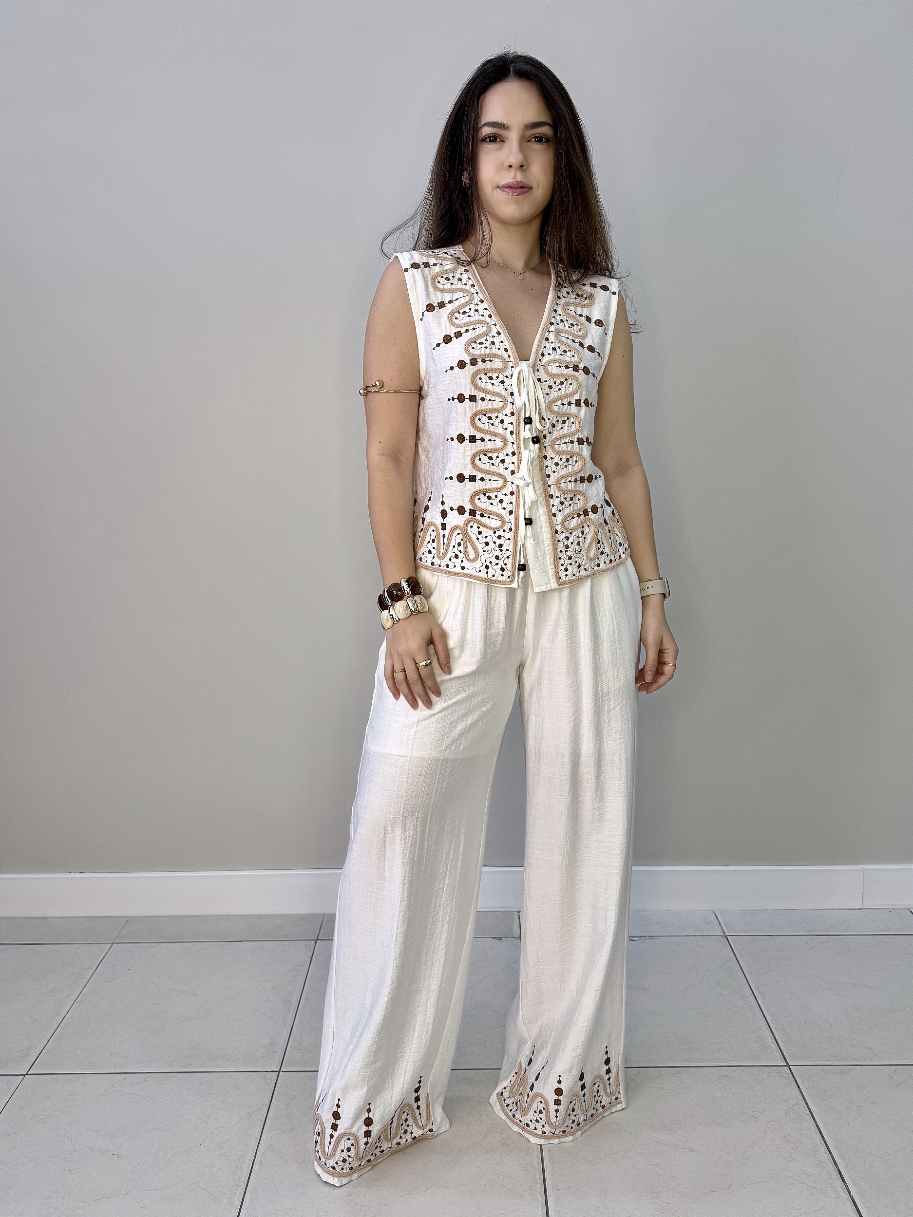 O Conjunto Feminino com Calça e Blusa é confeccionado em tecido leve e sofisticado, composto por 75% poliamida e 25% viscose, garantindo conforto, frescor e caimento impecável. A blusa possui amarração frontal e delicados bordados, que também se repetem na barra da calça, criando um visual harmonioso e elegante. A calça conta com forro interno, oferecendo segurança e melhor acabamento. Perfeito para produções cheias de estilo e feminilidade.