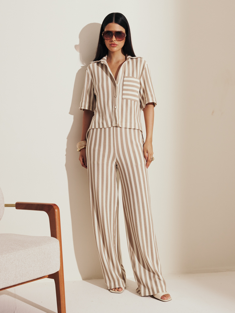 O Conjunto Feminino em listras é confeccionado em tecido leve e confortável, garantindo excelente caimento e estilo. Composto por calça pantalona com bolsos e blusa de manga curta com botões frontais, apresenta um design moderno, onde a parte de trás é levemente mais alongada que a frente, proporcionando um toque de elegância e movimento ao look.
