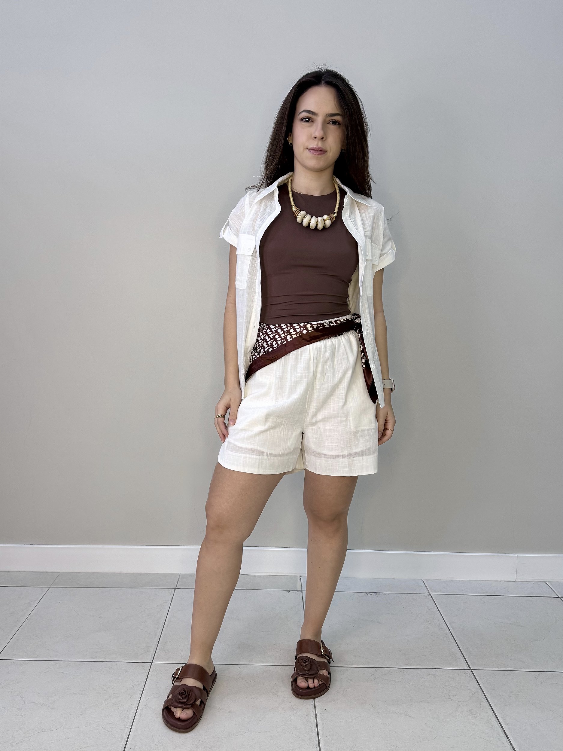 O Conjunto Feminino é confeccionado em tecido 100% algodão, garantindo conforto, respirabilidade e um toque natural à pele. A blusa possui botões frontais e bolso funcional, unindo praticidade e estilo. O shorts conta com bolsos laterais e forro interno em poliéster, proporcionando segurança e ótimo caimento. Um conjunto versátil e moderno, perfeito para composições leves e elegantes.