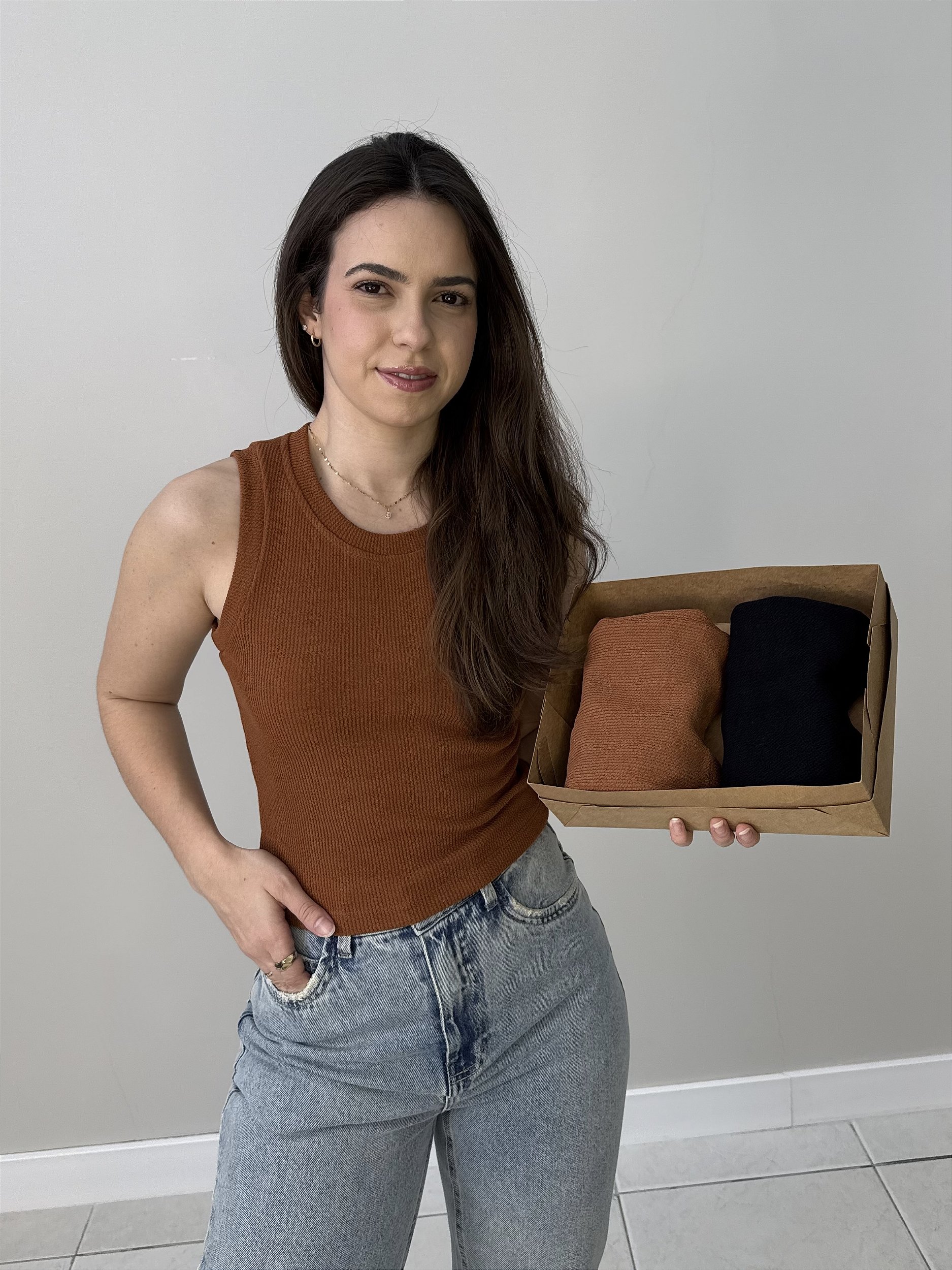 O kit inclui 2 regatas nas cores terracota e preta, combinações clássicas e modernas que permitem criar diversos looks.