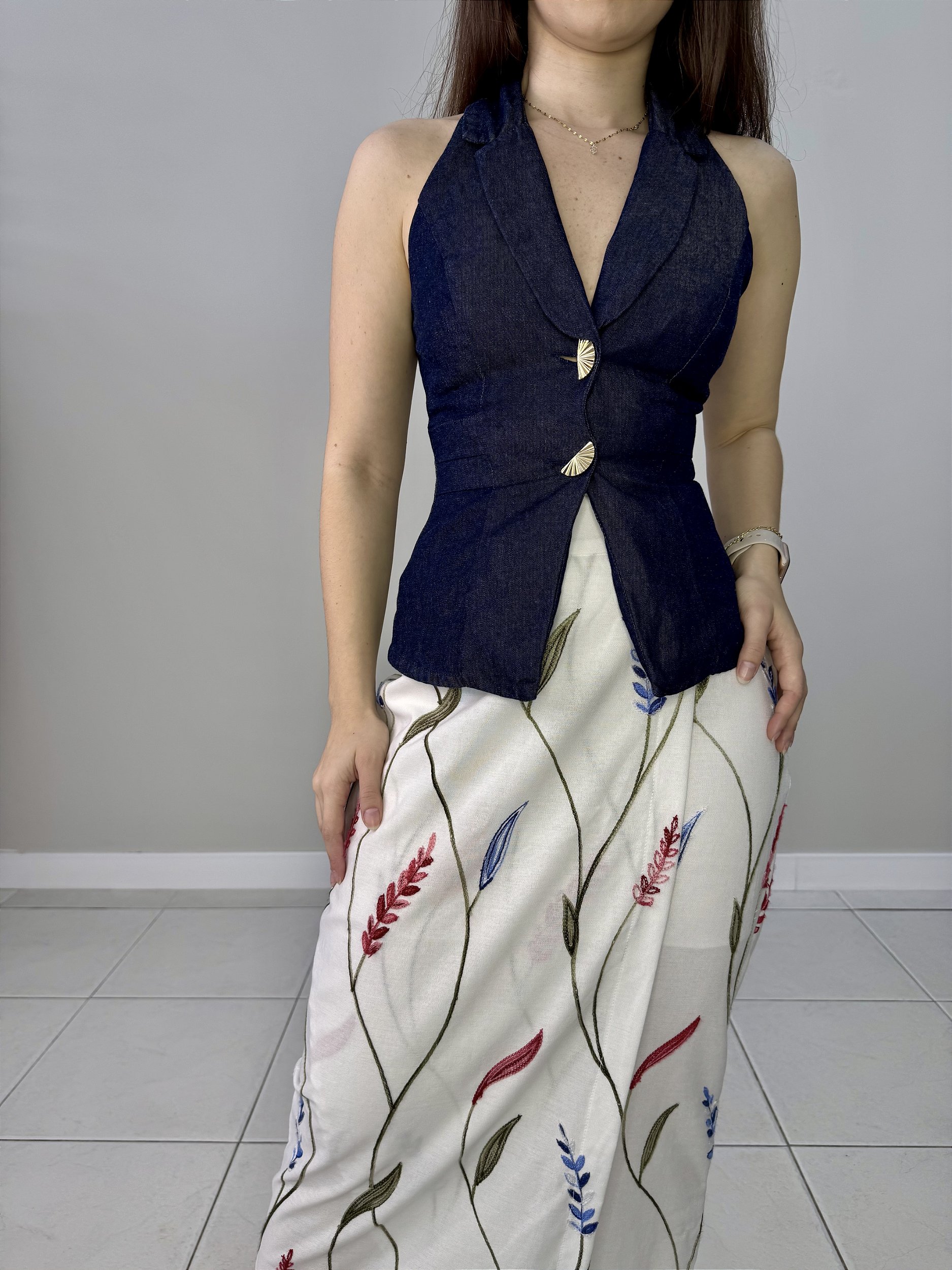 A Saia Envelope é confeccionada no mesmo tecido do top, com mistura de poliéster, viscose e linho, garantindo leveza, conforto e toque natural. Possui fechamento por zíper na lateral e detalhe em recorte envelope, que valoriza a silhueta com elegância. O tecido com bordados delicados adiciona um toque artesanal e sofisticado à peça. Ideal para compor um conjunto moderno e feminino.