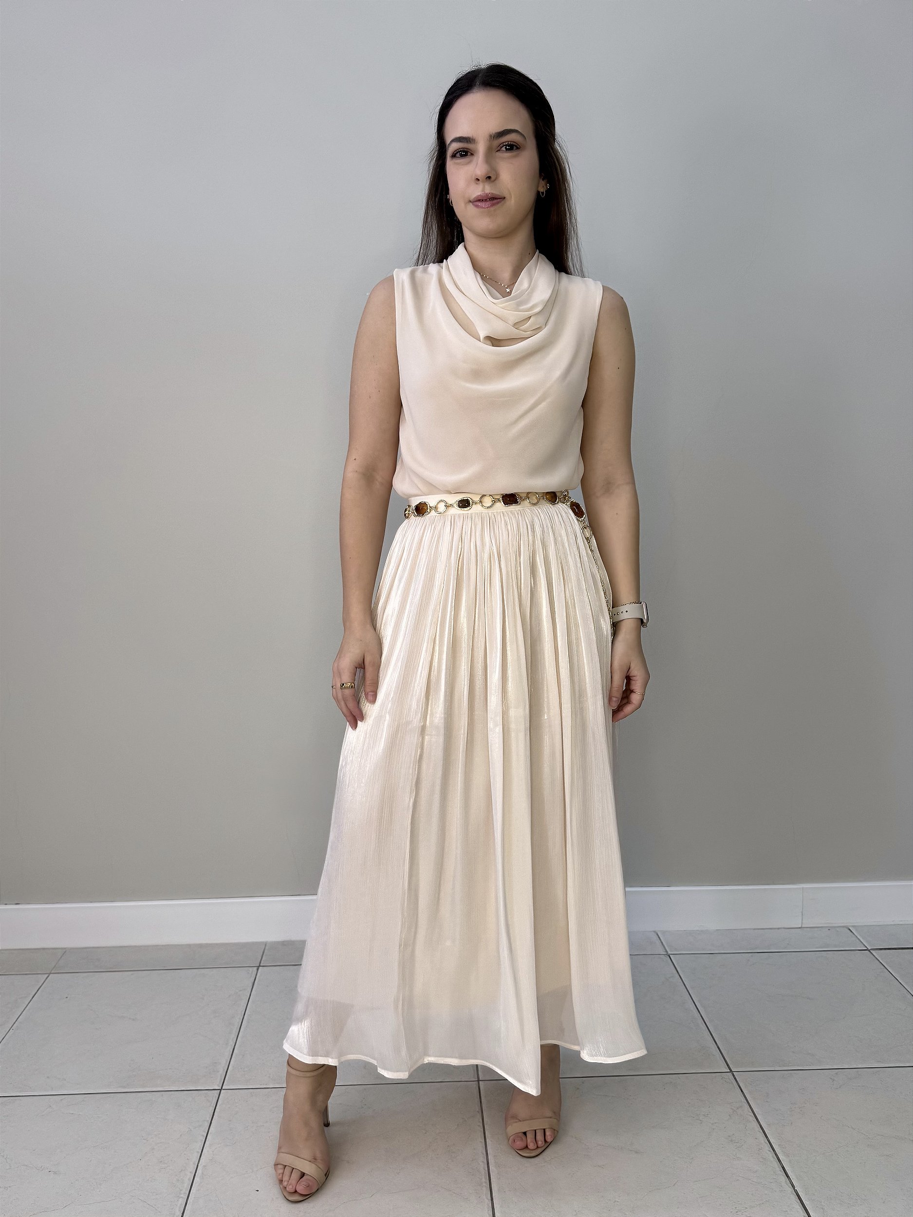 Atenção: Esta peça possui acabamento acetinado, que confere um toque de brilho e movimento ao look.