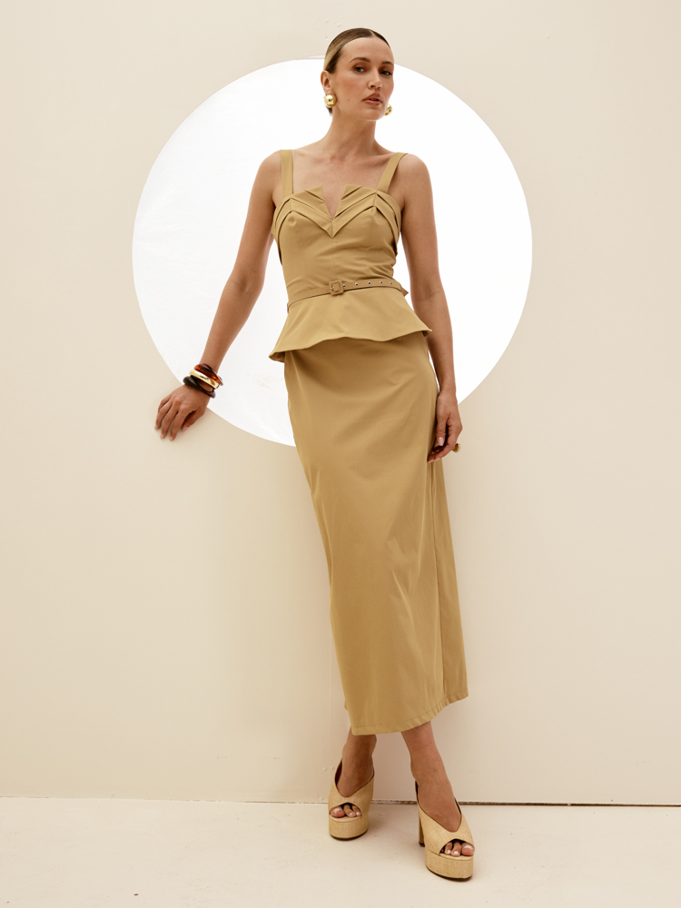 Possui cinto que valoriza a cintura e pregas no corpo, criando o efeito de duas peças como se fosse uma combinação de blusa e saia, entregando um visual moderno e refinado.